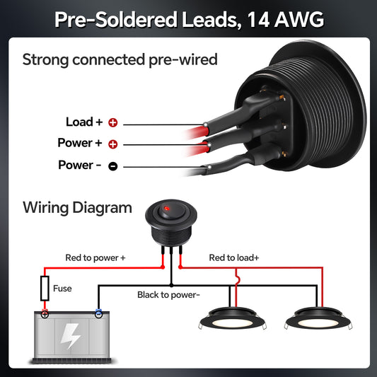 12V ON/OFF Aluminum Rocker Toggle Switch Round 20A SPST Switch, 14 AWG Pre-wired Leads for Campervan Boat Truck Car Auto, 1” 25mm Drill Hole, Nut Fastening Mount