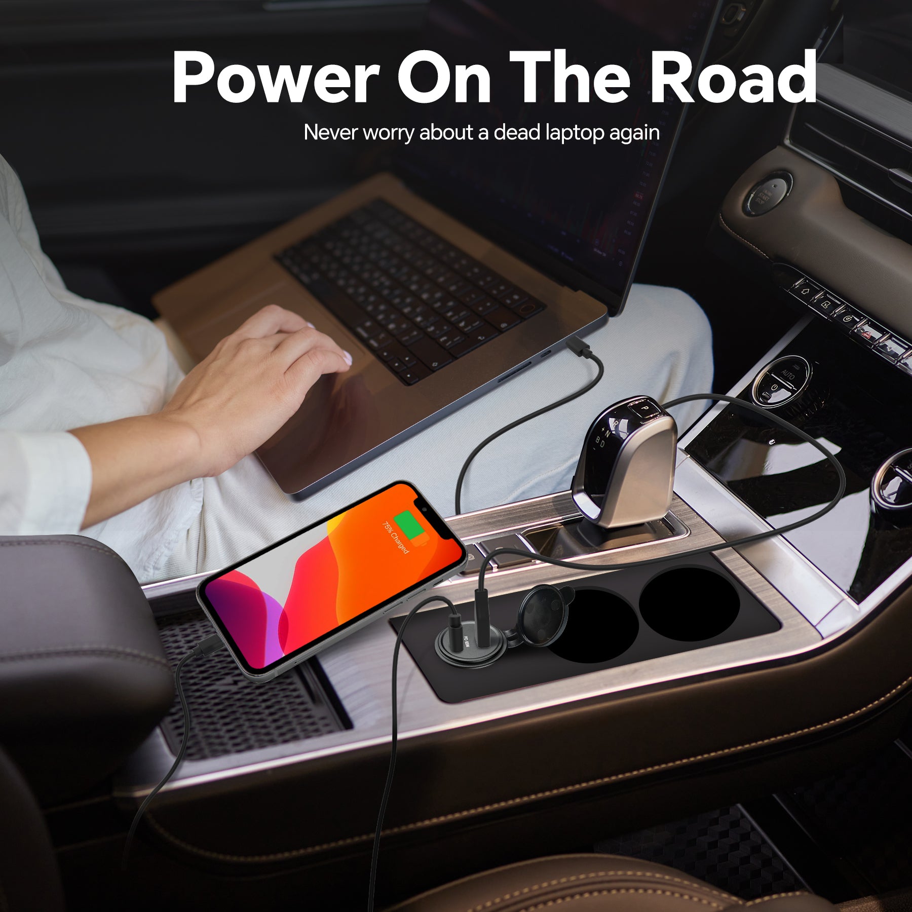Independent Dual-port Rapid Charging: This 12V car usb charger can charge two devices simultaneously at its full power without power sharing or reduction. The 65W USB-C port powers laptops/Starlink Mini/phones, while the 18W USB-A port quickly charges phones/tablets. Featuring 83W versatile high-power charging, makes it perfect for family road trips