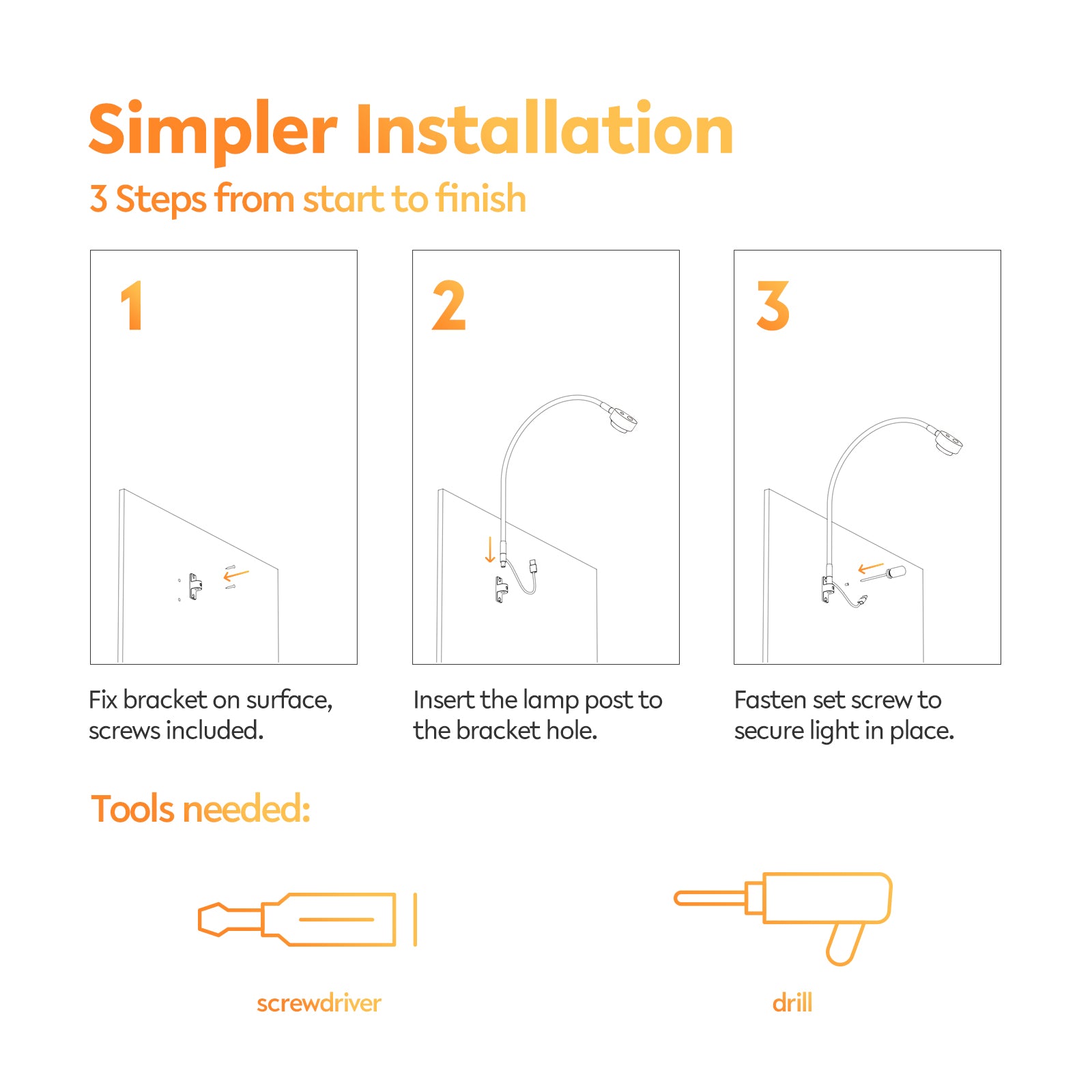 Split Stand, Easy Installation: The small but sturdy metal stand can be flexibly mounted on the wall beside the bed, wooden bed frame, or headboard. The lamp is secured sturdily to the stand by set screws. It only takes 2-3 minutes to install, easy and fast