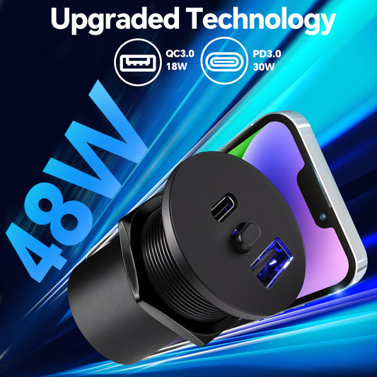 48W 12V USB Socket Outlet, PD3.0 30W+QC3.0 18W Built-in Switch& Blue Backlight