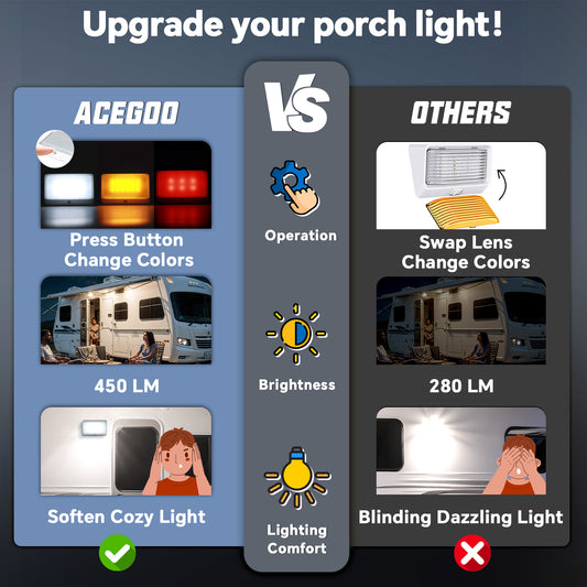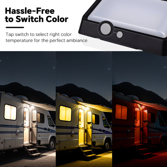 RV 12V Exterior Porch Light with 3 Lighting Modes (1800K, 6500K, Red) - On/Off Switch, IP65 for Boat Truck Motorhome & 5th Wheels