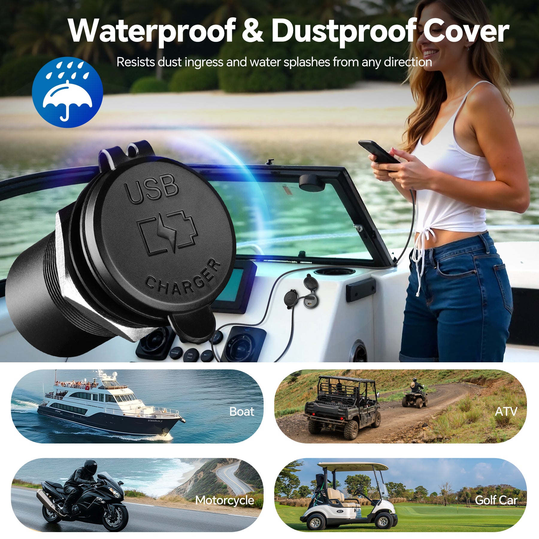 Waterproof Cover for All-Weather Use: A newly added waterproof cover protects the USB outlet from rain, splashes, and dust. Ideal for mobile automobiles application like RV camping, boat trips, marine cruising, or golf cart driving
