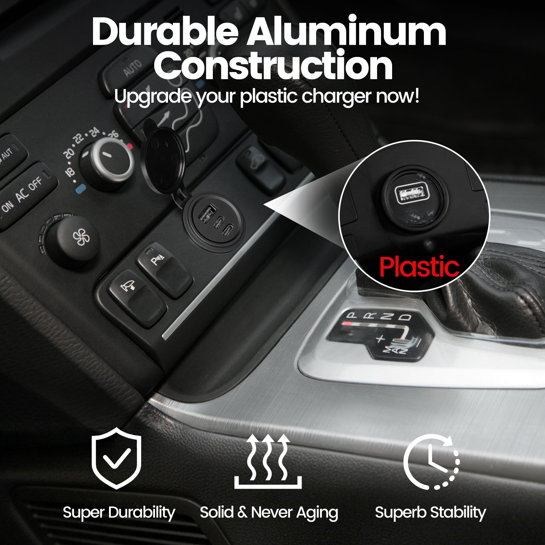 All-Aluminum Build: Unmatched cooling and durability. Tired of plastic chargers that overheat or crack under minimal use? Our all-aluminum 12V USB outlet is the ultimate solution. Its metal body dissipates heat 60% faster than plastic, which helps maintain stable power output—even in extreme environments like scorching RV interiors or boat cabins. Its sturdy aluminum construction resists warping and wear, ensuring it far outlasts any plastic charger