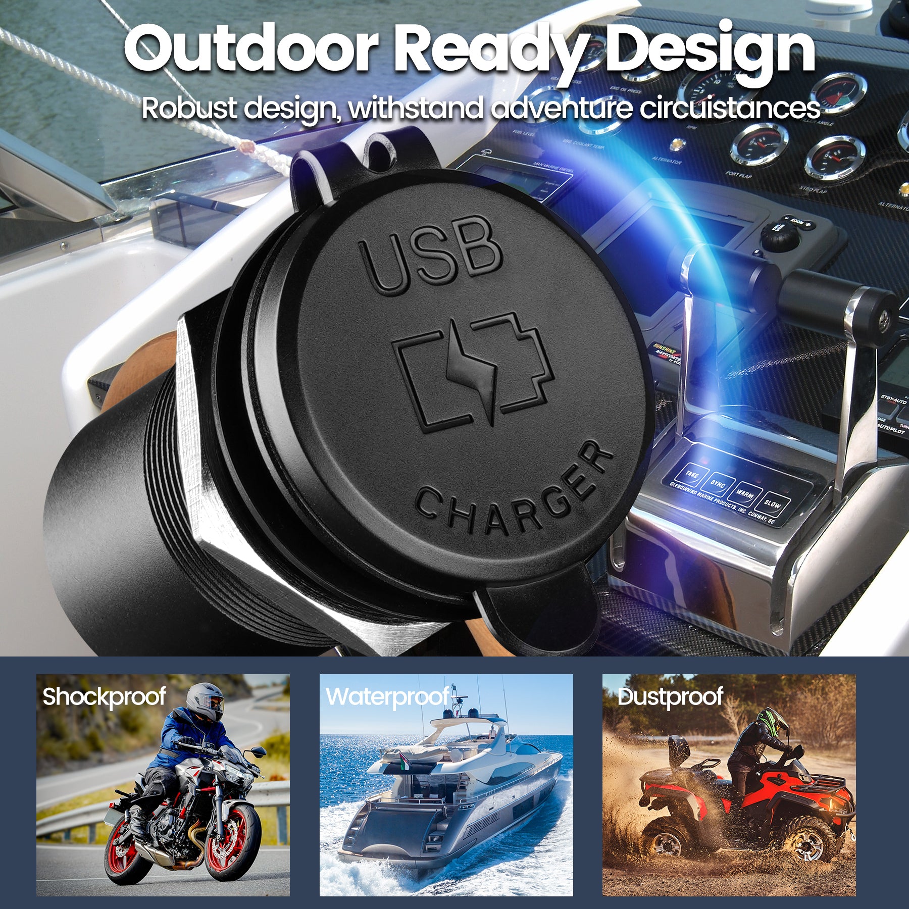 Outdoor-Ready Design: Built for adventure—engineered for RVs, boats, and rugged terrain, this USB socket features two key reliability upgrades. A detachable waterproof cover creates a tight seal, protecting the ports from splashes, rain, and dust. Meanwhile, dual locking mechanism secures the socket firmly in place, preventing loosening from bumps and vibrations. It's the ideal charging hub for all your outdoor vehicles and marine vessels