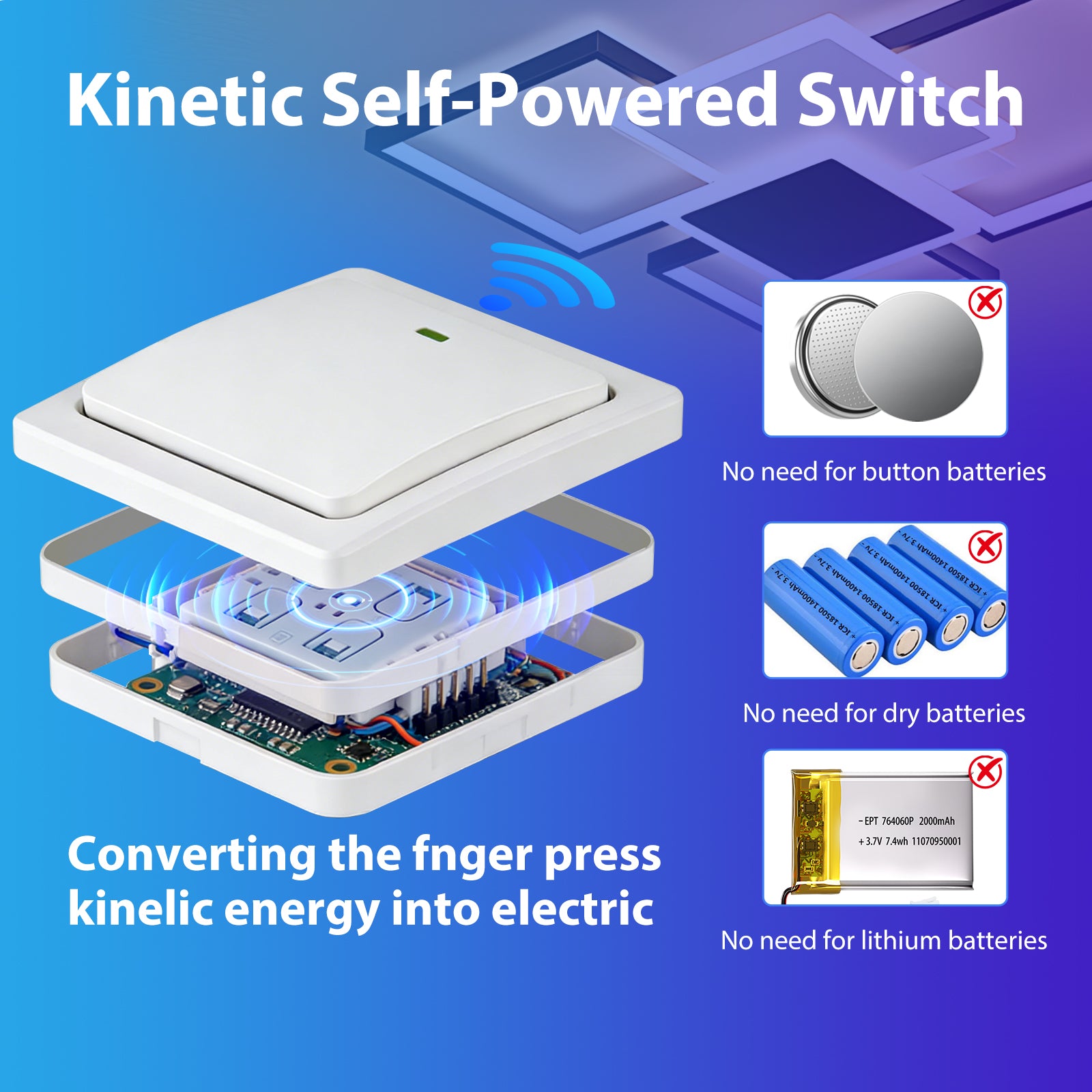 No Wiring Switch - Innovative energy harvesting technology, press switch to produce electricity. Wireless battery-free switch can be installed wherever without running additional wires, also used as portable switch