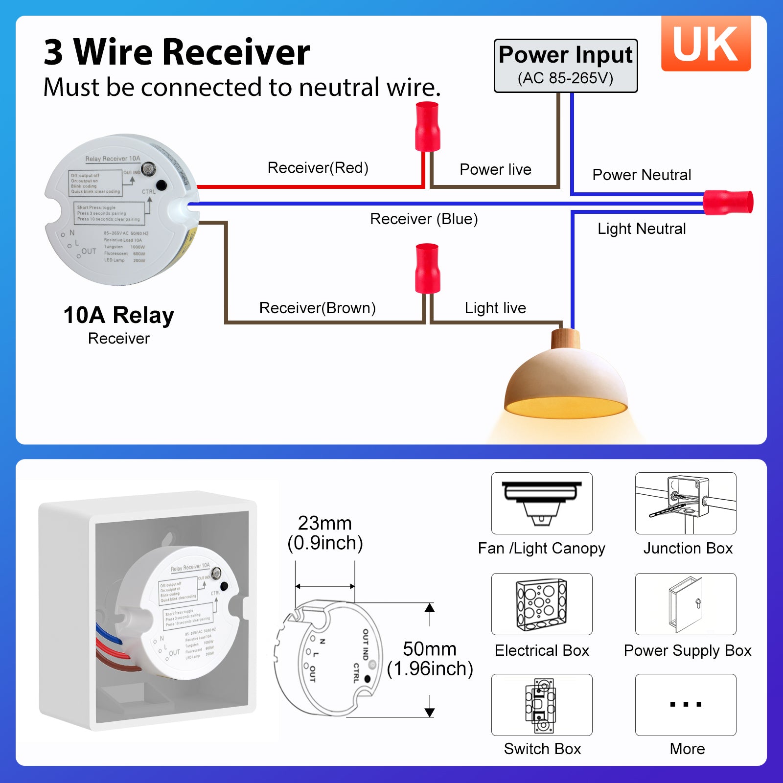 Compact Receiver -Small size receiver(connect to lights or other loads) fits limited space, such as electrical junction box, lights canopy, recessed box, existing switch box(neutral wire required), hidden in ceiling or surface mounting, etc